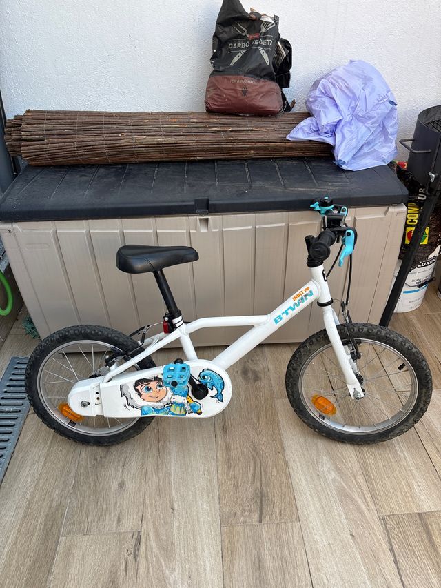 Detalles del productoBicicleta infantil de la marca Btwin, ideal para los más pequeños. Su diseño es blanco con detalles de dibujos animados.