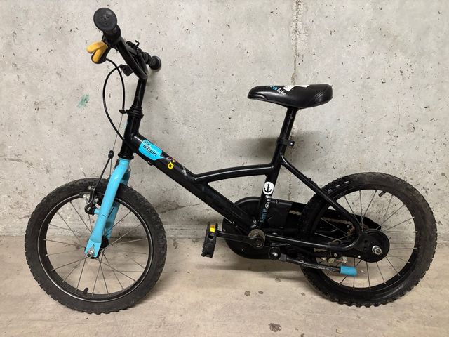 Bicicleta infantil Btwin en color negro y azul. - Ruedas de 16 pulgadas. - Sillín negro. - Manillar negro con puños amarillos.