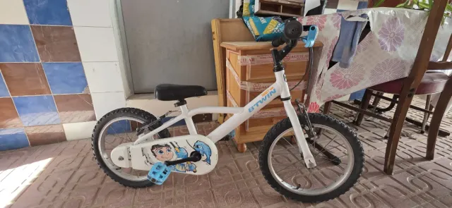 Bicicleta infantil Btwin de color blanco con detalles de dibujos. - Ruedas de 16 pulgadas. - Pedales de color azul. - Sillín negro.