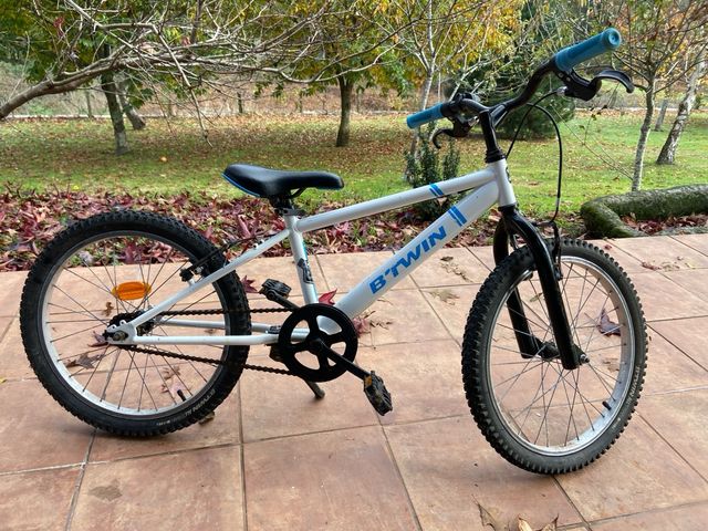 Bicicleta infantil de la marca Btwin, ideal para los más pequeños. - Cuadro de color blanco con detalles azules. - Manillar y puños de color azul. - Ruedas de 20 pulgadas.