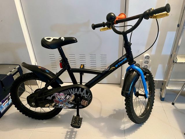 Bicicleta infantil de la marca BTWIN, ideal para los más pequeños. - Color negro con detalles en azul. - Ruedas de 16 x 1.75