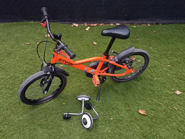 Bicicleta infantil BTwin de 16 pulgadas, ideal para los primeros pedaleos. - Color naranja. - Incluye ruedines de apoyo.