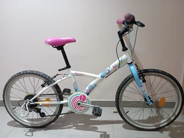 Detalles del productoBicicleta infantil Btwin en color blanco con detalles coloridos.