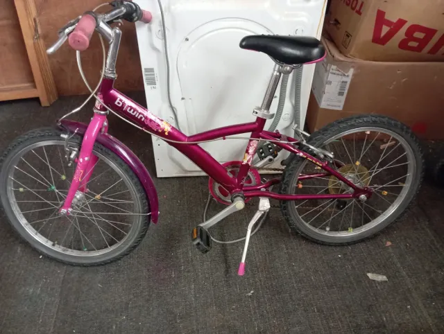 Bicicleta infantil de la marca Btwin, color morado. - Ruedas de 16 pulgadas. - Frenos delanteros y traseros. - Sillín ajustable. - Guardabarros delantero y trasero.