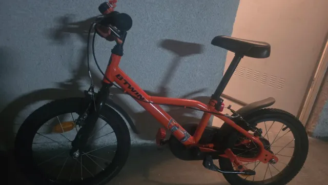 Bicicleta infantil de color naranja, ideal para los más pequeños. - Marca Btwin. - Ruedas de 16 pulgadas. - Frenos de mano.