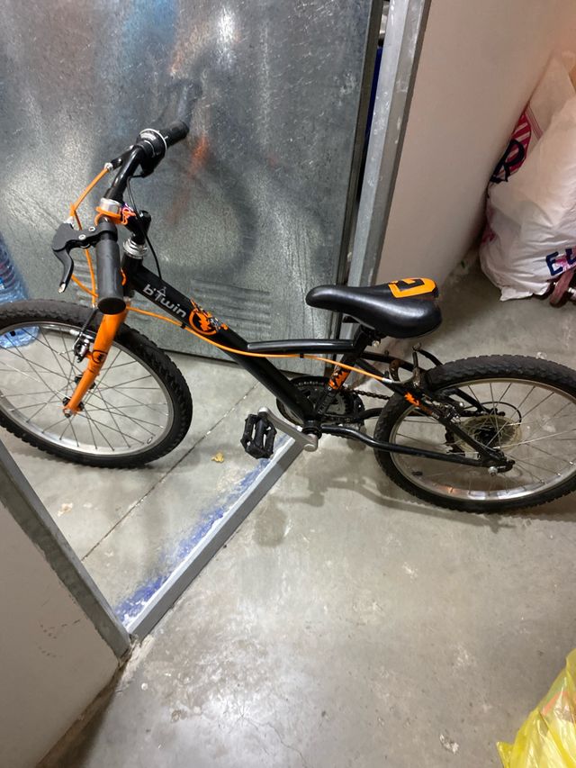 Detalles del productoBicicleta infantil Btwin en color negro con detalles naranjas.