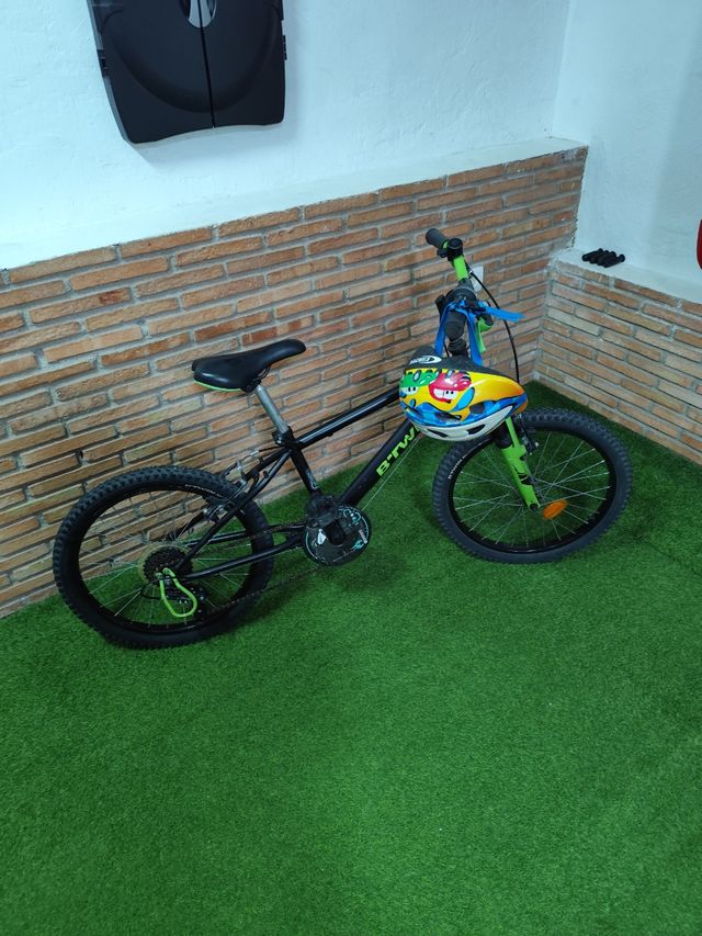 Bicicleta infantil Btwin en color negro con detalles en verde. - Cuadro de acero. - Ruedas de 20 pulgadas. - Frenos delanteros y traseros.