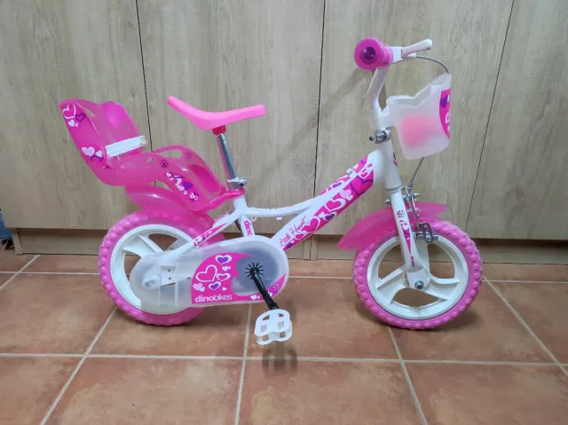 Detalles del productoBicicleta infantil DinoBike en colores rosa y blanco, con un diseño divertido y llamativo.