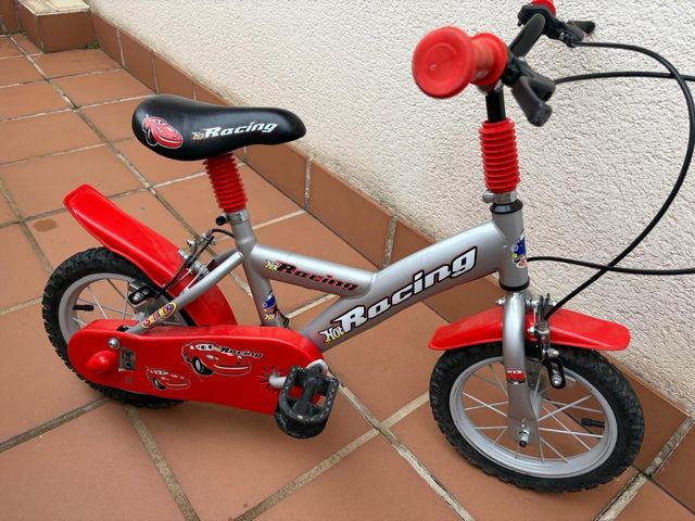 Bicicleta infantil con diseño deportivo. - Color plateado y rojo. - Ruedines incluidos. - Decoración de Cars en el sillín y guardabarros.
