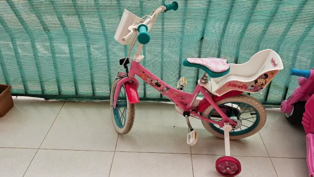 Detalles del productoBicicleta infantil de color rosa con diseño de Minnie Mouse. Incluye ruedines.