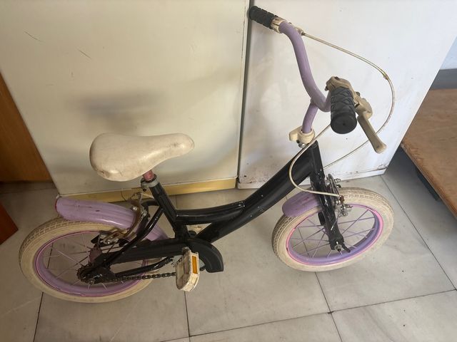Bicicleta infantil con un diseño llamativo en color morado y negro. - Ruedines incluidos. - Manillar morado. - Sillín blanco.