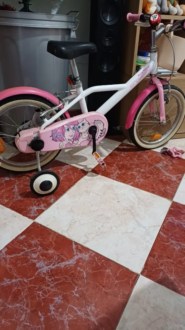 Bicicleta para niña en buen estado, ideal para aprender a pedalear. - Color rosa y blanco. - Ruedines incluidos. - Diseño con dibujos de gatitos y niñas.