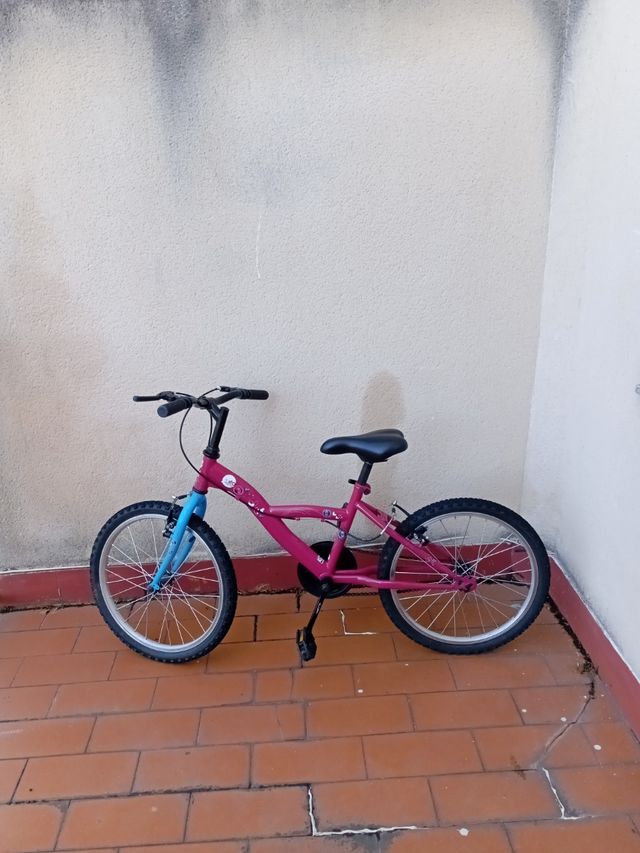 Bicicleta infantil de color rosa con detalles en azul. - Ruedas de 20 pulgadas. - Sillín negro. - Manillar negro.