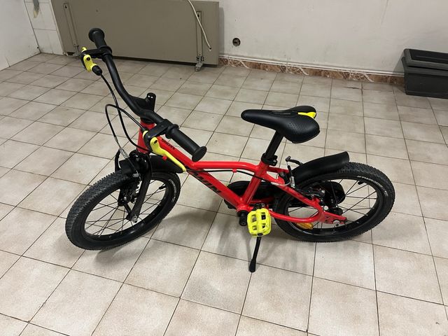 Bicicleta de paseo para niños en color rojo. - Cuadro de metal resistente. - Ruedas de 16 pulgadas. - Pedales amarillos. - Sillín negro. - Guardabarros trasero.