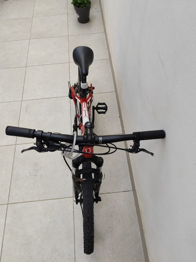 Bicicleta de montaña para niñ@s, ideal para iniciarse en el ciclismo. - Cuadro de color rojo y blanco. - Manillar negro. - Sillín negro. - Ruedas negras