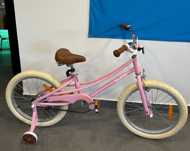 Bicicleta infantil de color rosa. - 20 pulgadas. - Ruedines incluidos para mayor estabilidad. - Sillín y puños en tono marrón. - Neumáticos de color crema.