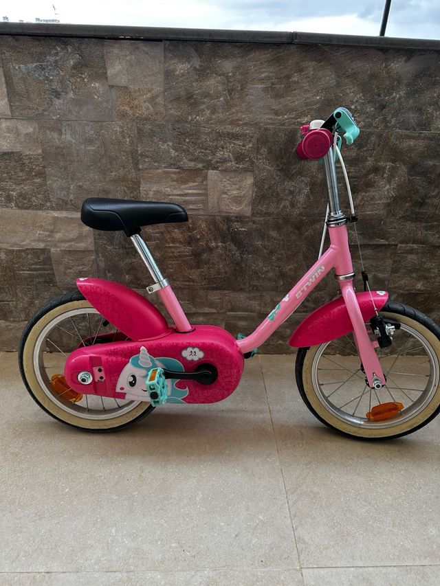 Detalles del productoBicicleta infantil de color rosa, ideal para los más pequeños. Cuenta con un diseño divertido y llamativo. No tengo los ruedines traseros.