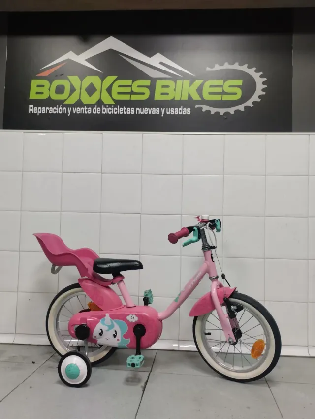 Detalles del productoBicicleta infantil de color rosa, ideal para los más pequeños. Cuenta con un asiento trasero para muñecos y ruedines para facilitar el aprendizaje.