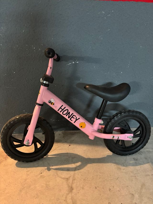 Bicicleta de aprendizaje infantil de color rosa con el diseño Honey. - Marco de metal. - Ruedas negras. - Sillín negro. - Diseño con abejas y panal.