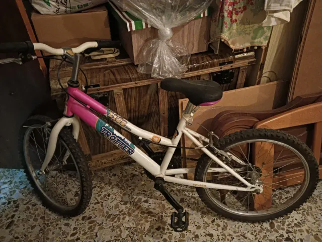 Bicicleta infantil de color blanco y rosa, ideal para niñas. - Ruedas de 20 pulgadas. - Frenos delanteros y traseros. - Sillín ajustable.