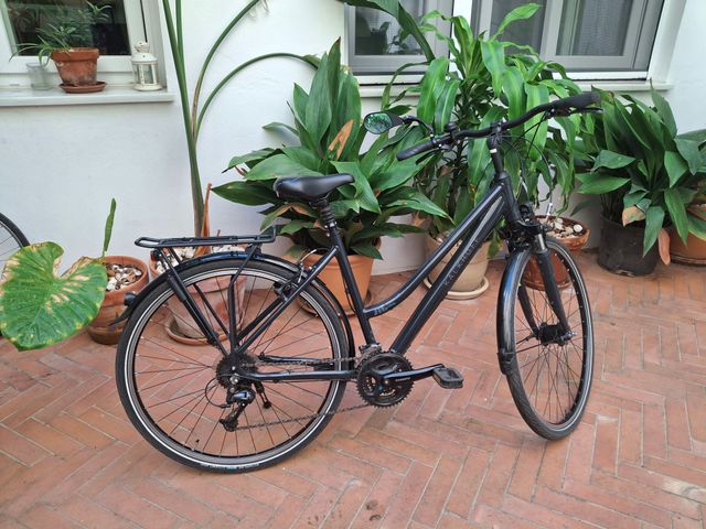 Fue un regalo de jubilación, apenas usada. Siempre ha dormido en un cuarto cerrado, sin exponerse al sol. Roces en las manetas de freno (ver foto), ha perdido el cubrecadenas. Por lo demás, impecable.