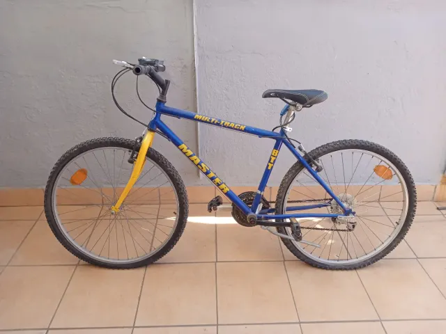 Detalles del productoBicicleta de montaña Master Multi-Track con un diseño llamativo en azul y amarillo.