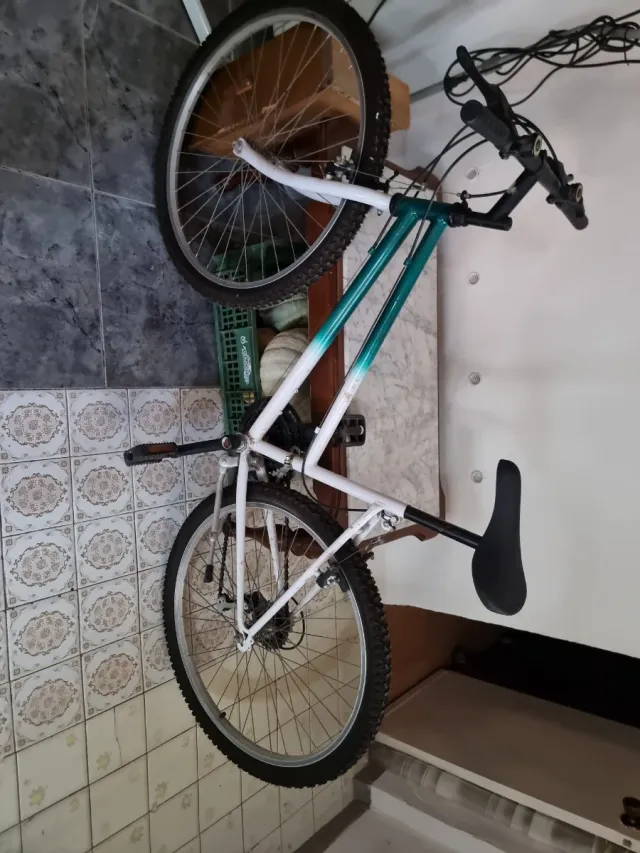 Bicicleta de montaña para mujer. - Cuadro blanco y verde. - Ruedas de 26 pulgadas. - Sillín negro.