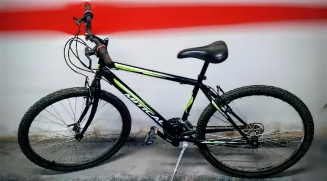 Bicicleta de montaña MITCAL con ruedas de 26 pulgadas. - Cuadro de color negro con detalles verdes. - Sillín negro. - Neumáticos de taco. Se ha usado sólo una vez