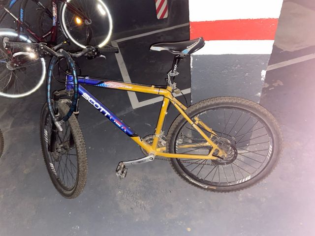 Bicicleta de montaña Scott con cuadro de aluminio. - Cuadro de aluminio. - Ruedas de 26 pulgadas. - Frenos de disco. - Color amarillo y azul.