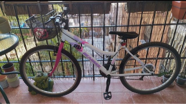 Bicicleta de montaña Enike, en buen estado, ideal para paseos. - Talla 26 pulgadas. - Color blanco y rosa. - Incluye cesta delantera.