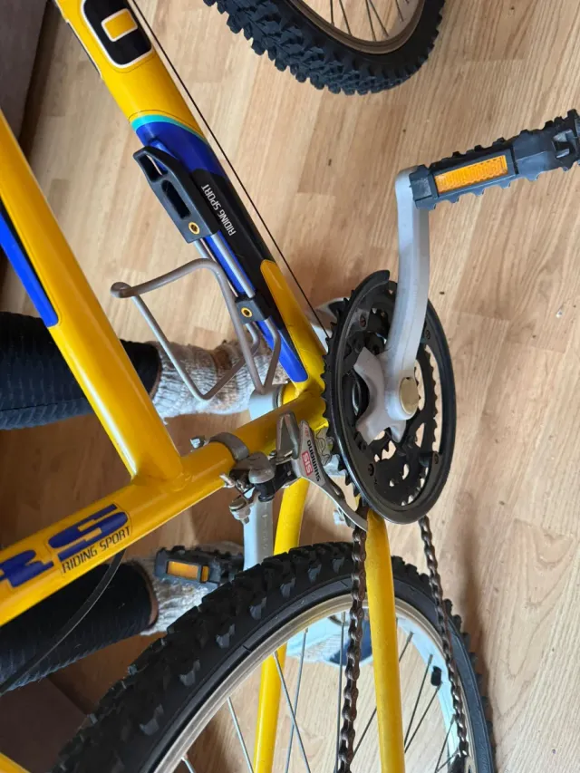 Bicicleta de montaña con un llamativo diseño en color amarillo. - Cuadro de bicicleta. - Ruedas de montaña. - Pedales con reflectores.