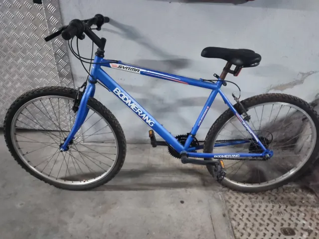 Bicicleta de montaña de color azul. - Marca Boomerang. - Modelo Syrna. - Ruedas de montaña. Rueda delantera pinchada.