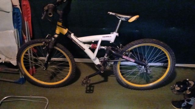 Detalles del productoBicicleta de montaña con doble suspensión y llantas amarillas.