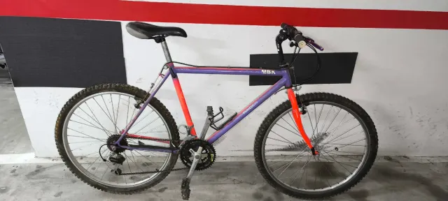 Bicicleta de montaña MBK Raider con ruedas de 26 pulgadas. - Cuadro de color morado y naranja. - Manillar regulable en altura. - Portabidón negro.