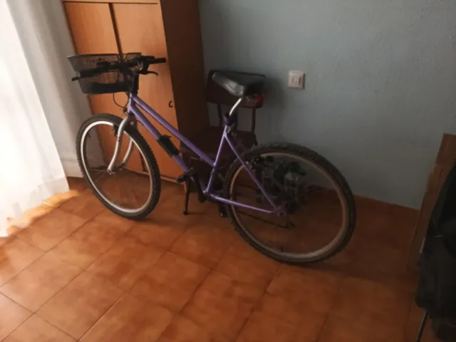 Detalles del productoBicicleta de montaña en color morado, ideal para adultos. Cuenta con una cesta delantera.