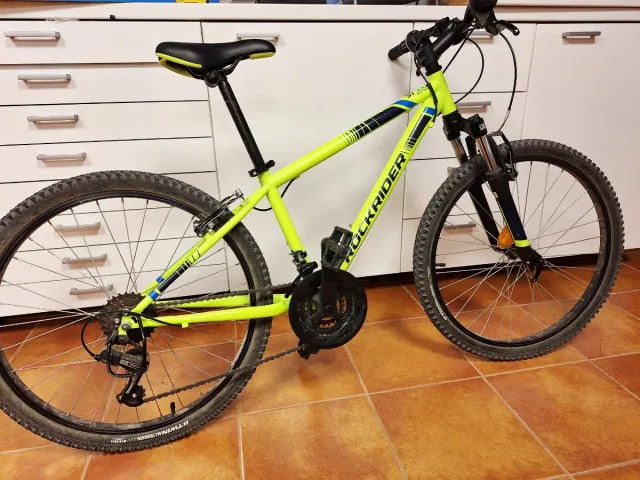 Detalles del productoBicicleta de montaña de color verde lima con detalles en azul y negro. Ideal para iniciarse en el ciclismo.