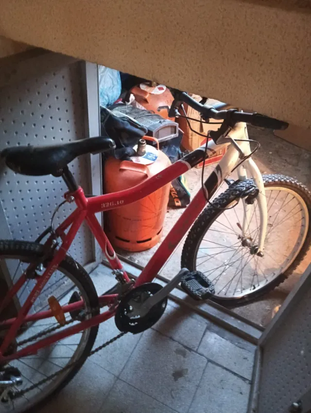 Bicicleta de montaña con cuadro rojo y detalles blancos. Ideal para paseos y rutas. - Cuadro de metal. - Ruedas de montaña. - Pedales de plástico.