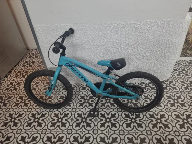 Bicicleta estilo BMX de la marca Monty en color azul. Rueda trasera pinchada y solo freno trasero. - Ruedas de 18 pulgadas. - Manillar negro. - Sillín negro.