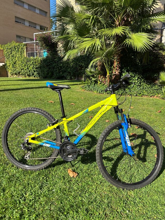 Bicicleta de montaña Monty KY8 en color amarillo y azul. - Cuadro de aluminio. - Ruedas de 27.5 pulgadas. - Frenos de pastillas (shimano). - Cambio Shimano.