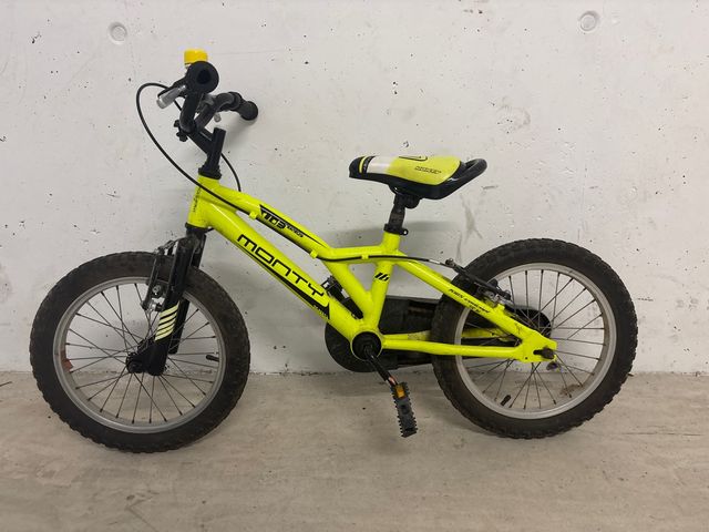 Bicicleta infantil de la marca Monty, ideal para los más pequeños. - Color amarillo llamativo. - Ruedas de 16 pulgadas. - Diseño deportivo. Recogida en Sitges