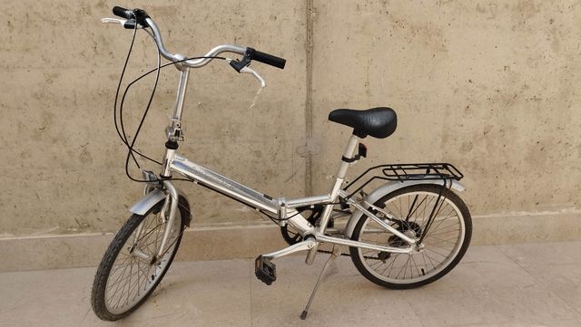 Detalles del productoBicicleta plegable de color plateado, ideal para desplazamientos urbanos o para llevarla contigo a donde vayas.