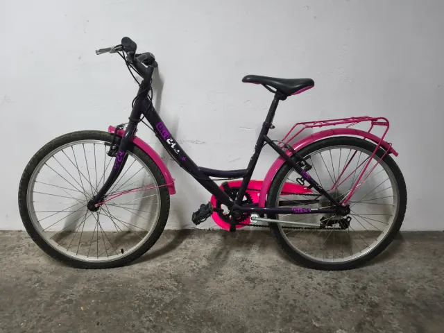Detalles del productoBicicleta infantil en color morado con detalles en rosa.