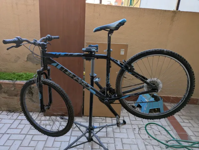 Detalles del productoBicicleta de montaña B-Pro en color negro con detalles azules. Ideal para disfrutar de rutas y senderos.