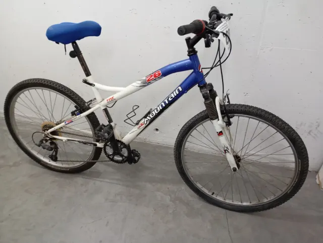 Bicicleta de montaña con ruedas de 26 pulgadas. Ideal para paseos y rutas. - Cuadro blanco y azul. - Sillín azul. - Suspensión delantera. - 21 velocidades( 3 platos y 7 piñones)