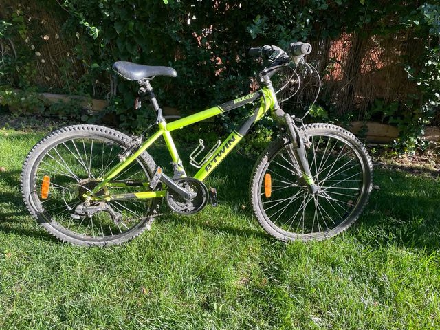 Bicicleta de montaña B'Twin Rockrider en color verde lima. - Cuadro de aluminio. - Ruedas de 26 pulgadas. - Frenos V-brake. - Cambio Shimano.