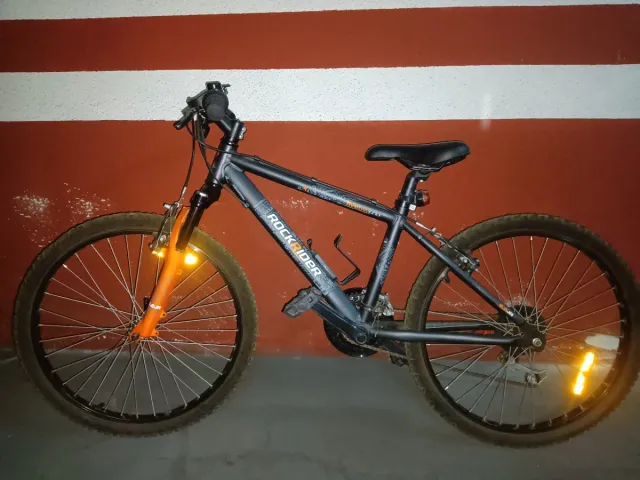 Bicicleta de montaña para jóvenes, modelo Rockrider. - Cuadro de aluminio. - Suspensión delantera. - Timbre - Ruedas de 24 pulgadas. - Color: Negro y naranja.