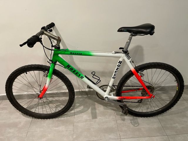 Detalles del productoBicicleta de montaña Razesa con un diseño llamativo en verde, blanco y rojo.