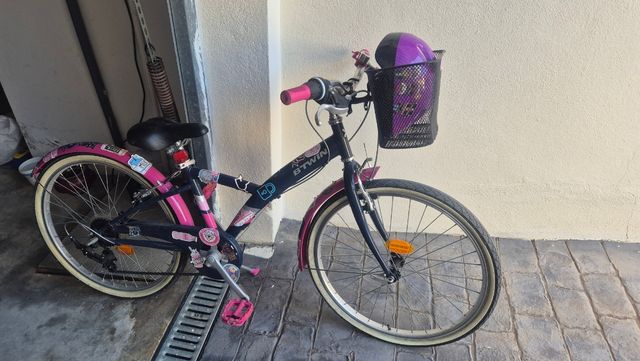 Detalles del productoBicicleta infantil Btwin en buen estado, ideal para niñas. Es de color rosa y negro, con pegatinas.