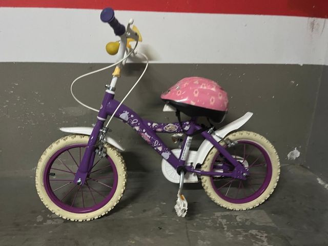 Detalles del productoBicicleta infantil de color morado, ideal para niñas de 3 a 6 años. Incluye casco rosa con estampado.