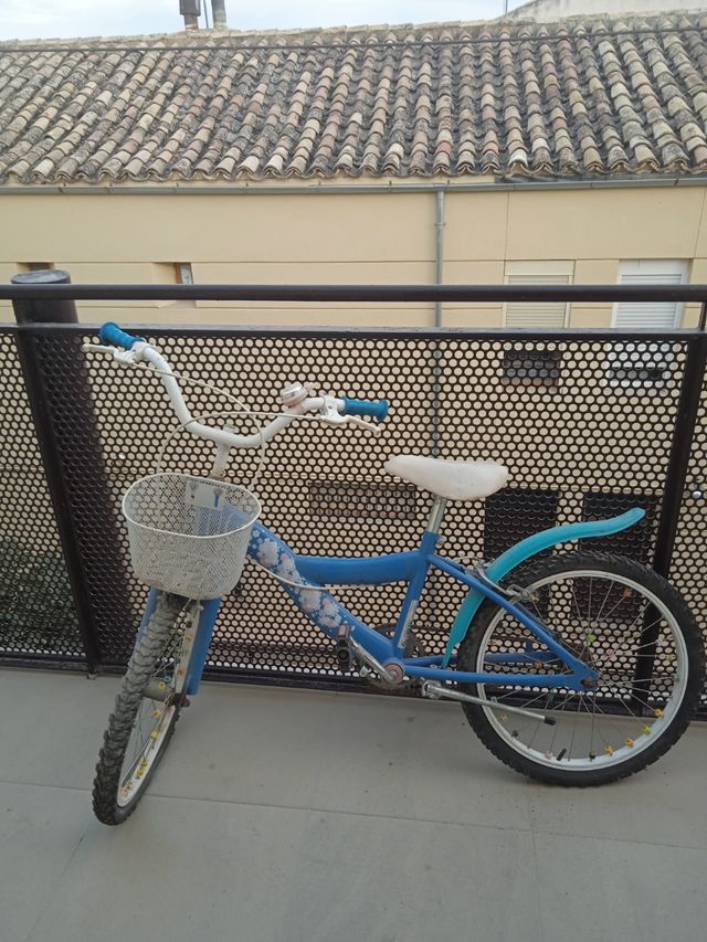 Detalles del productoBicicleta infantil de color azul, ideal para niñas de unos 8 años. Cuenta con una cesta delantera y guardabarros.